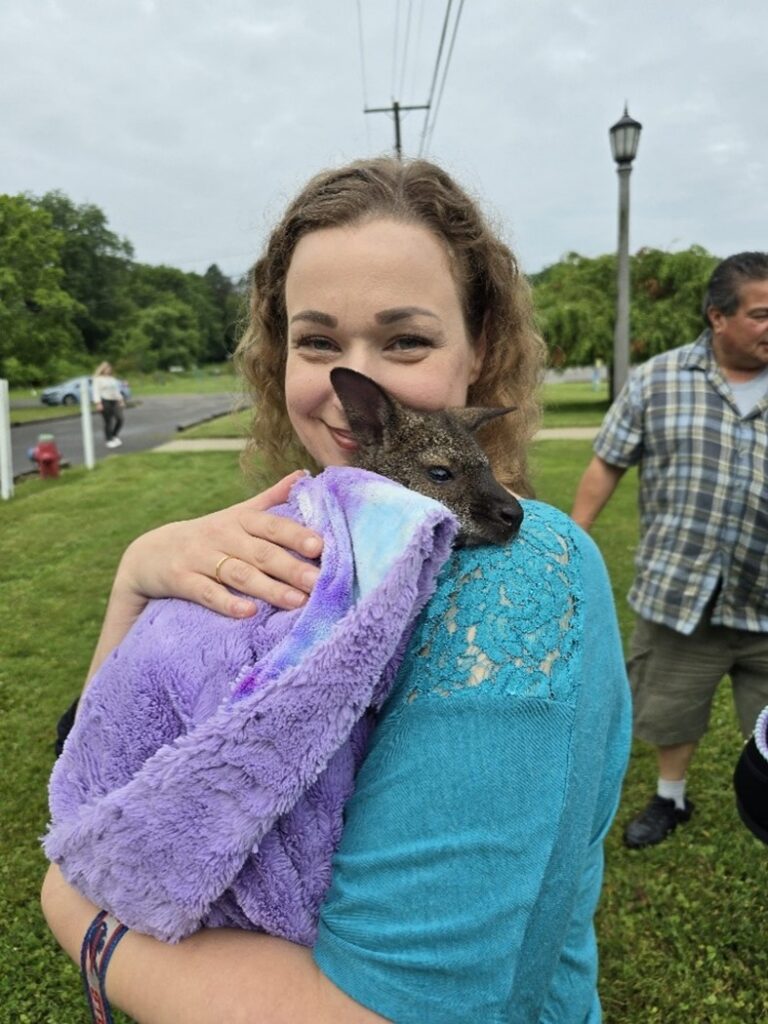 The day was filled with activities representing all eight dimensions of wellness. Programming included trauma-informed yoga, sound therapy, foam printmaking with Locust Street Art, and the creation of aromatherapy bracelets made with lava beads. Our most popular session involved holding a swaddled wallaby named Charlie, brought by Niagara Down Under, alongside other animals such as owls, goats, and tortoises. Hawk Creek Sanctuary, brought birds of prey and educational displays including animal pelts.