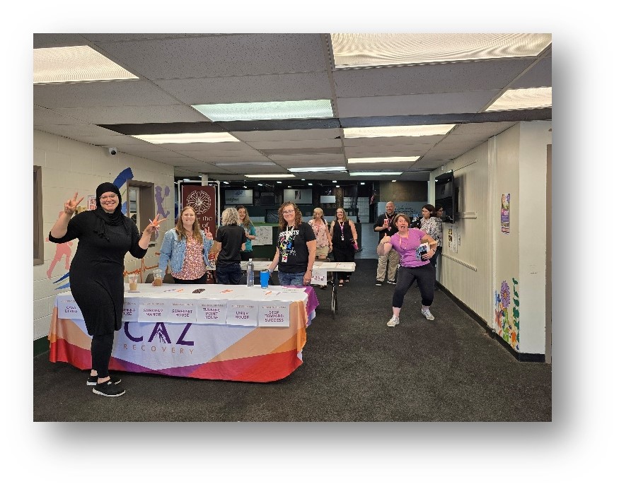 Attendees also met with a financial planner and an attorney from Neighborhood Legal Services who spoke about housing and civil legal issues. Other tables were staffed by the Caz Team. Danyel Brewer, Registered Dietitian and Lactation Consultant, offered guidance on nutrition; Caitlynn Weichert-Winkfield, Vocational Specialist and Javier Pagán, Turning Point House Counselor, led an environmental wellness table on recycling; and Michelle Harvey, Turning Point House Case Manager, shared her passion for holistic care with aromatherapy bracelets. Many moments of joy and movement brought a different side to recovery. We had an obstacle course bounce house that drew laughter and friendly competition as residents and staff raced through the inflatable challenge. This showed that healing and play could happen at the same time.